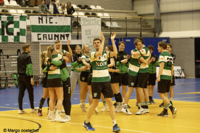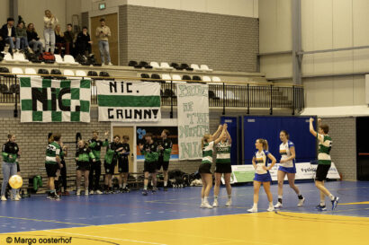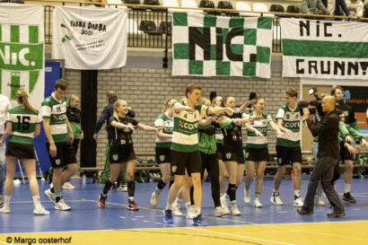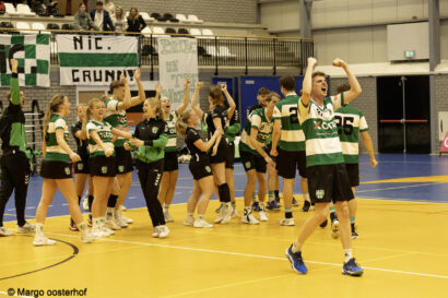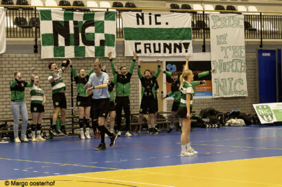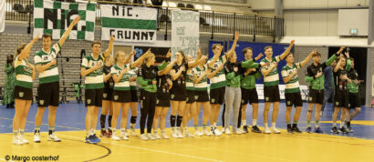 Een ware apotheose moest en zou het zaterdagavond worden in het Alfa-college. Alle ingrediënten voor een spektakelstuk waren aanwezig: Nic. nam het in eigen huis op tegen koploper Wit-Blauw/Green Organics in een rechtstreeks duel om het kampioenschap in de Overgangsklasse A, het verschil op de ranglijst was slechts één punt en het Alfa-college was goed gevuld, mede dankzij twee volle supportersbussen van de gasten uit Kampen. Een spektakelstuk werd het: de wedstrijd bleef tot ver in de tweede helft spannend, tot Nic. een gat van vier/vijf punten sloeg en dat niet meer uit handen gaf. Daarmee kroont Nic. zich tot kampioen en keert onze club volgend seizoen terug in de Hoofdklasse.